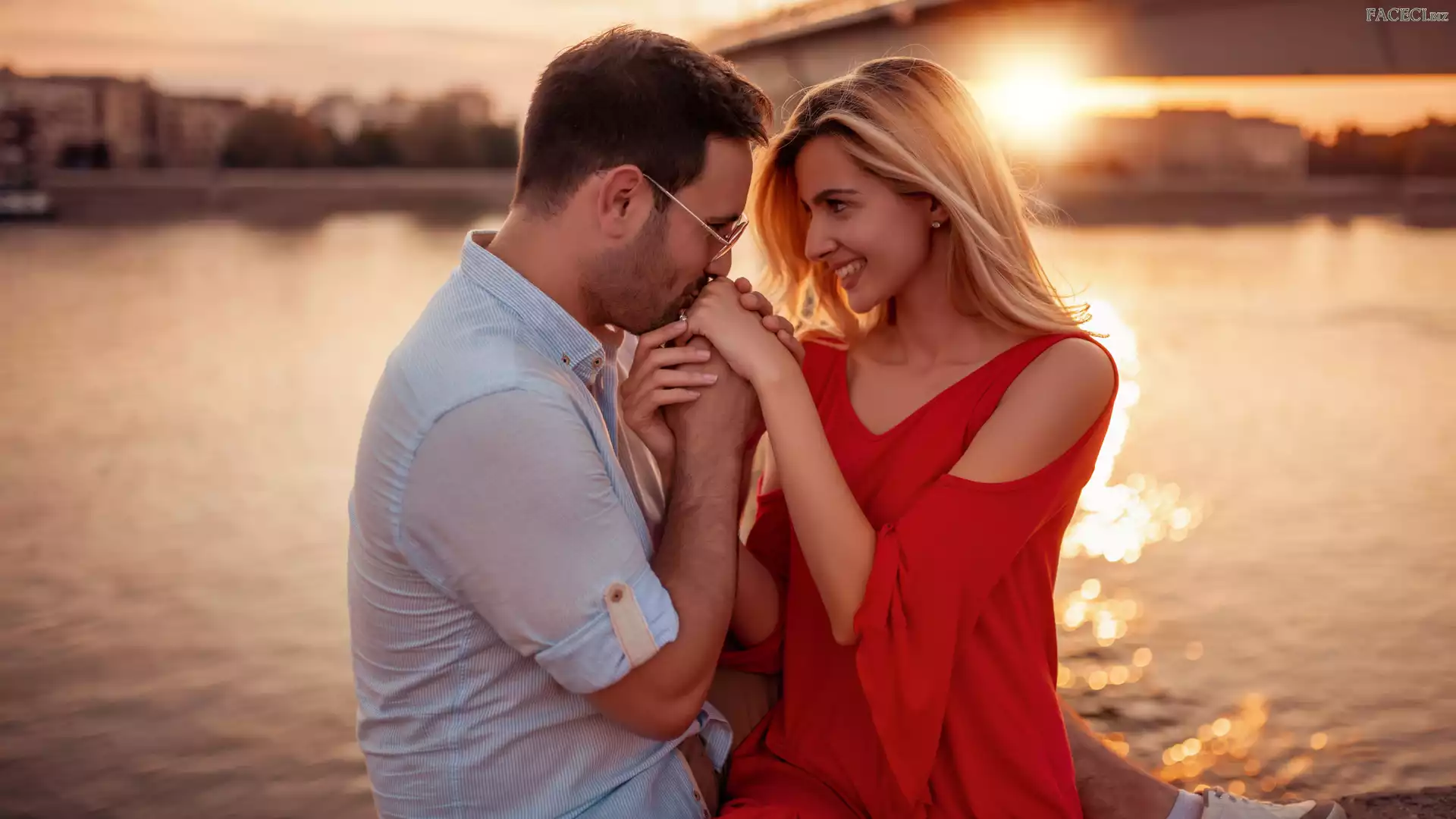 Uśmiech, Kobieta, Para, Sukienka, Mężczyzna, Zakochani, Czerwona - faceci.biz